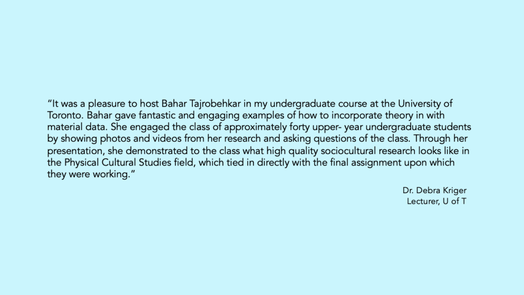 Tajrobehkar, B. (2018, July). Stretching Boundaries: Iranian Girls’ Stories of Movement and Belonging. International Sociological Association (ISA) World Congress of Sociology, Toronto, Ontario, Canada.